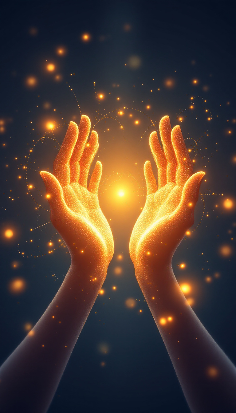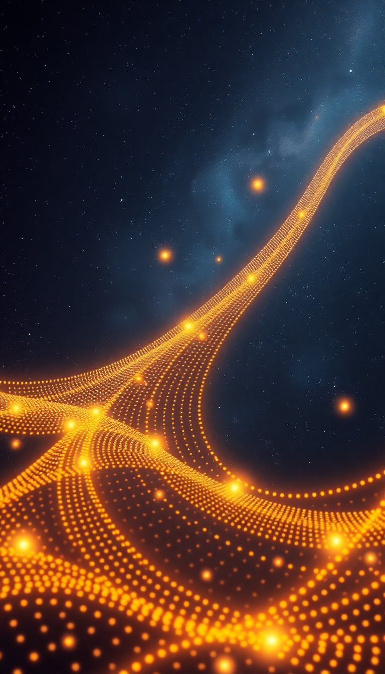 Create a serene and futuristic illustration of energy grid on a galaxy background, glowing energy waves made of golden and orange dots, flowing smoothly and creating a sense of harmony and balance. Incorporate subtle circular patterns and light rings, symbolizing energy fields and mindfulness. The galaxy background should be dimly lit, using cool tones like deep blue and gray to enhance the glowing warmth of the energy waves. Emphasize a calm and introspective atmosphere.