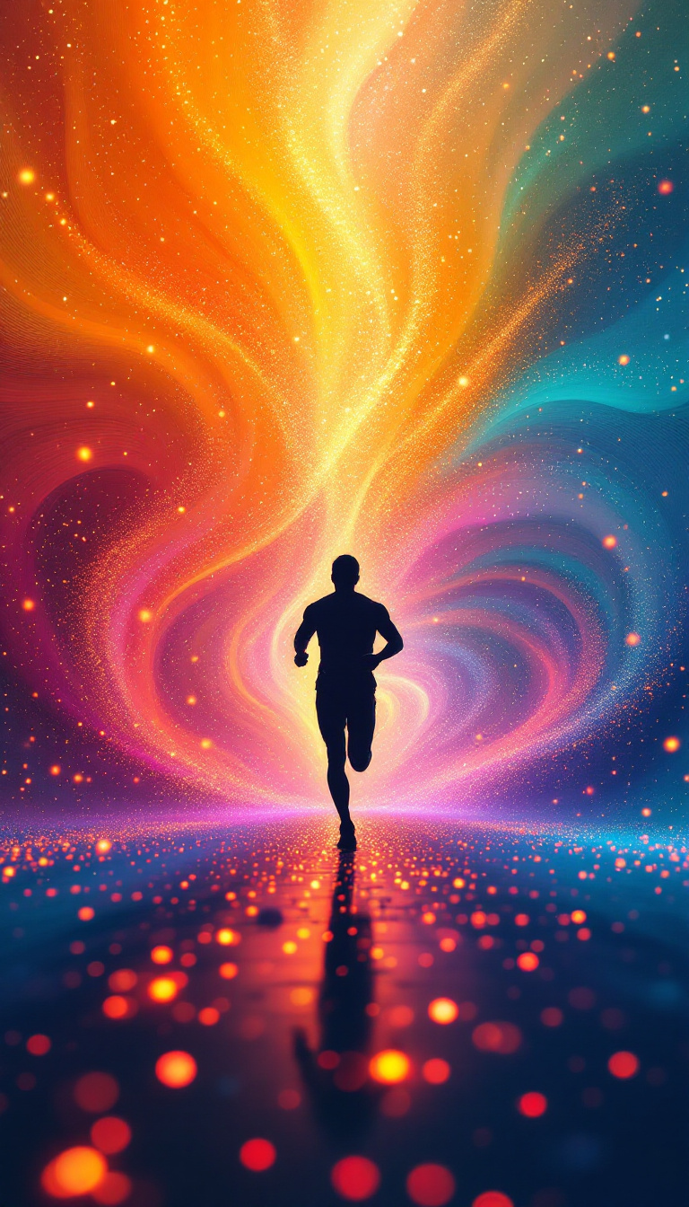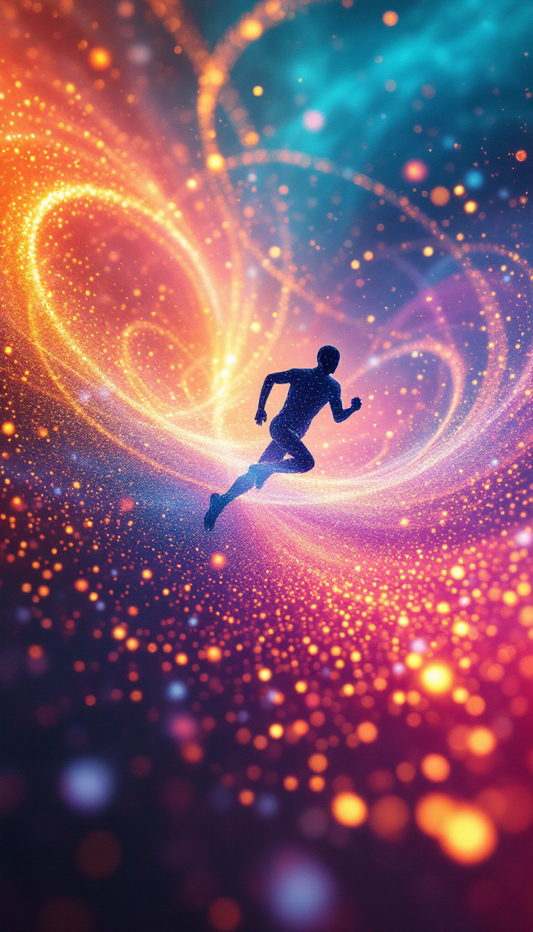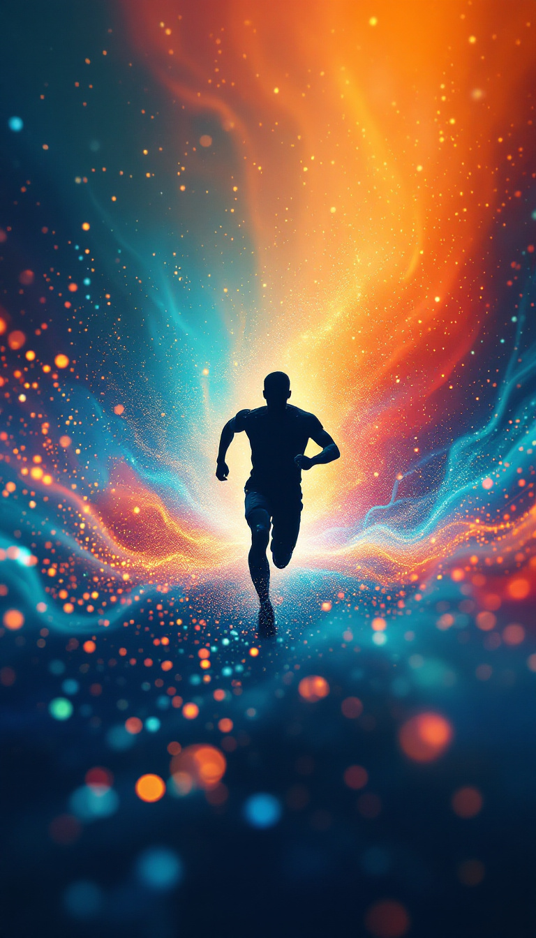 Create an artistic depiction of a small silhouette of a human figure running, surrounded by an abstract, colorful swirl of light and energy make up of small dots. The background features a gradient transitioning from warm hues like red and orange on one side to cool hues like blue and teal on the other. The swirling energy consists of glowing dots and particles of varying sizes, giving a dynamic, cosmic effect. The runner is positioned in the center, facing forward, with the energy converging around them, creating a vibrant and energetic atmosphere. Floating in the background are the major organs of human body, including heart, brain, lung, liver, kidney signifying cell metabolism helps the organs. The scene should evoke a sense of movement, power, and vitality.