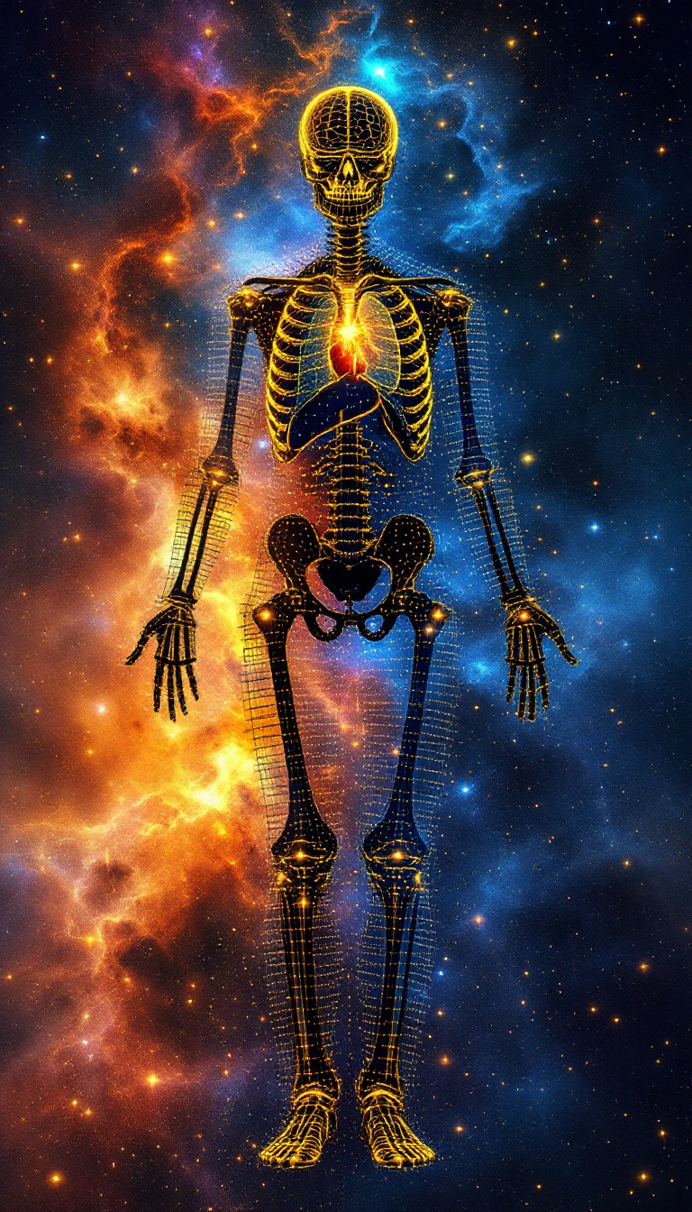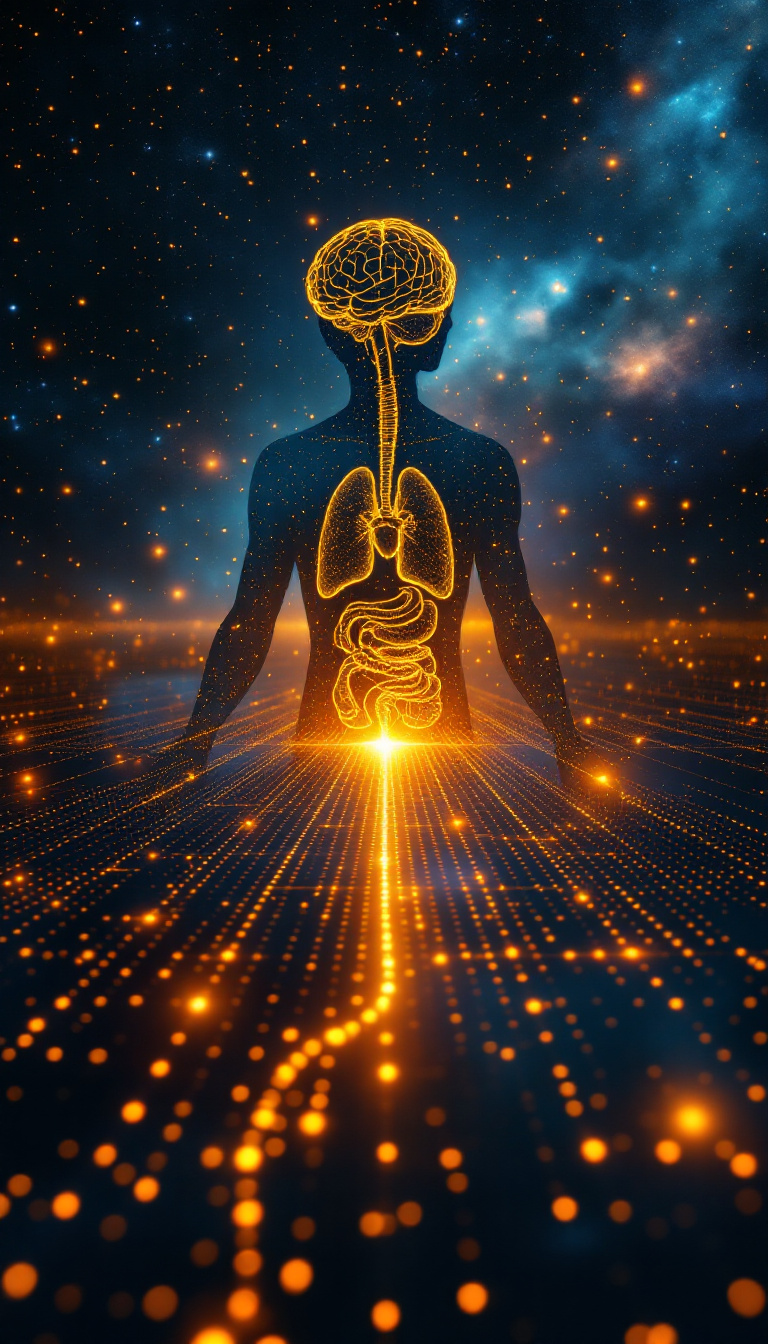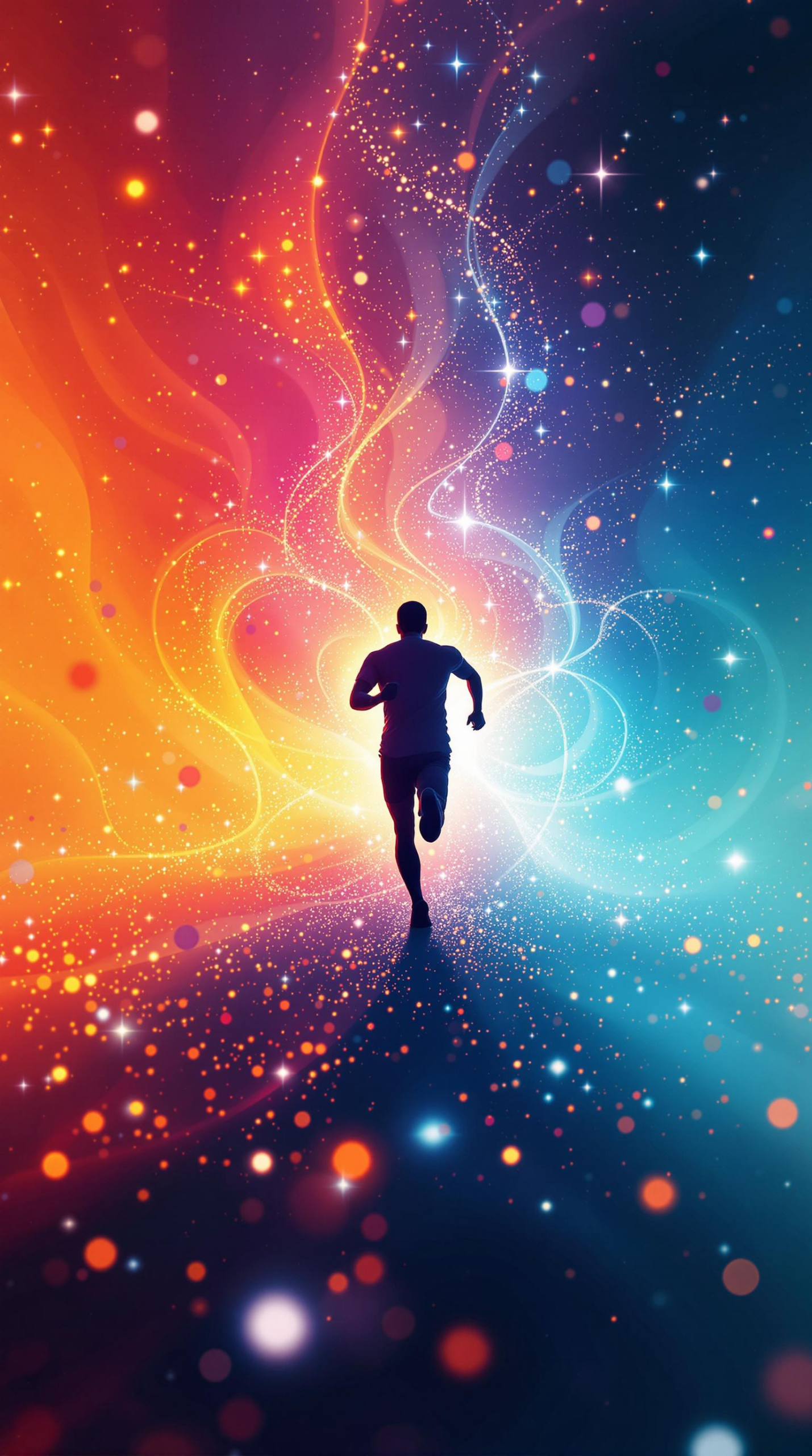 Create an artistic depiction of a small silhouette of a human figure running, surrounded by an abstract, colorful swirl of light and energy make up of small dots. The background features a gradient transitioning from warm hues like red and orange on one side to cool hues like blue and teal on the other. The swirling energy consists of glowing dots and particles of varying sizes, giving a dynamic, cosmic effect. The runner is positioned in the center, facing forward, with the energy converging around them, creating a vibrant and energetic atmosphere. Floating in the background are the major organs of human body, including heart, brain, lung, liver, kidney signifying cell metabolism helps the organs. The scene should evoke a sense of movement, power, and vitality.